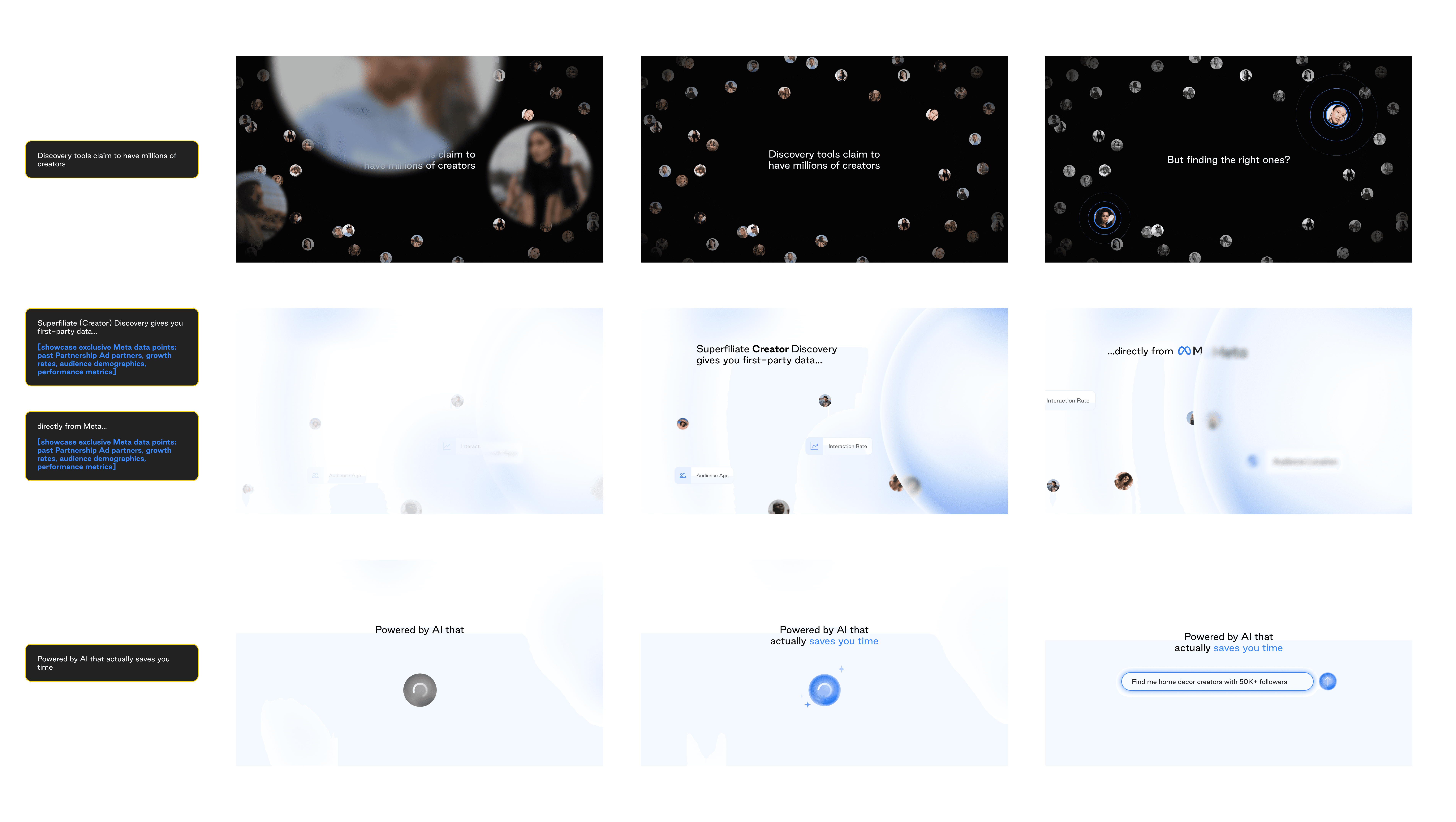 Os designers da Superfiliate me procuraram para colaborar no desenvolvimento de um vídeo promocional para o lançamento da nova ferramenta da empresa: a AI Meta Discovery, que usa inteligência artificial para identificar e conectar marcas aos criadores ideais.